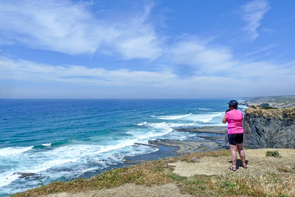 <Nach einem fantastischen Frühstück fahren Sie in Richtung Süden zu den atemberaubenden Klippen und Stränden von Odeceixe. Dieses malerische Dorf markiert die Grenze zwischen den Regionen Alentejo und Algarve. Sein unberührter, hufeisenförmiger Strand ist der perfekte Einstieg in die spektakuläre Landschaft, die vor Ihnen liegt. Machen Sie sich auf den Weg und lassen Sie sich von diesem Ort, an dem goldener Sand und üppige Dünen auf den ins Meer mündenden Fluss Aljezur treffen, verzaubern. Umgeben von unberührter Schönheit ist dies ein idyllischer Ort, an dem Sie eine Verschnaufpause einlegen und die friedliche Atmosphäre genießen können, bevor Sie weiterradeln. Freuen Sie sich auf atemberaubende Ausblicke auf eine der berühmtesten Steilküsten der Algarve entlang des Weges. Wenn Sie in Chabouco ankommen, werden Sie das Gefühl haben, den Tag gut verbracht zu haben, nachdem Sie einige der schönsten Küsten und Dörfer Portugals durchquert haben. Diese Rad-Tagestour ist eine perfekte Mischung aus Natur, Geschichte und Küstenabenteuer und bietet ein unschlagbares Erlebnis entlang der portugiesischen Küste.