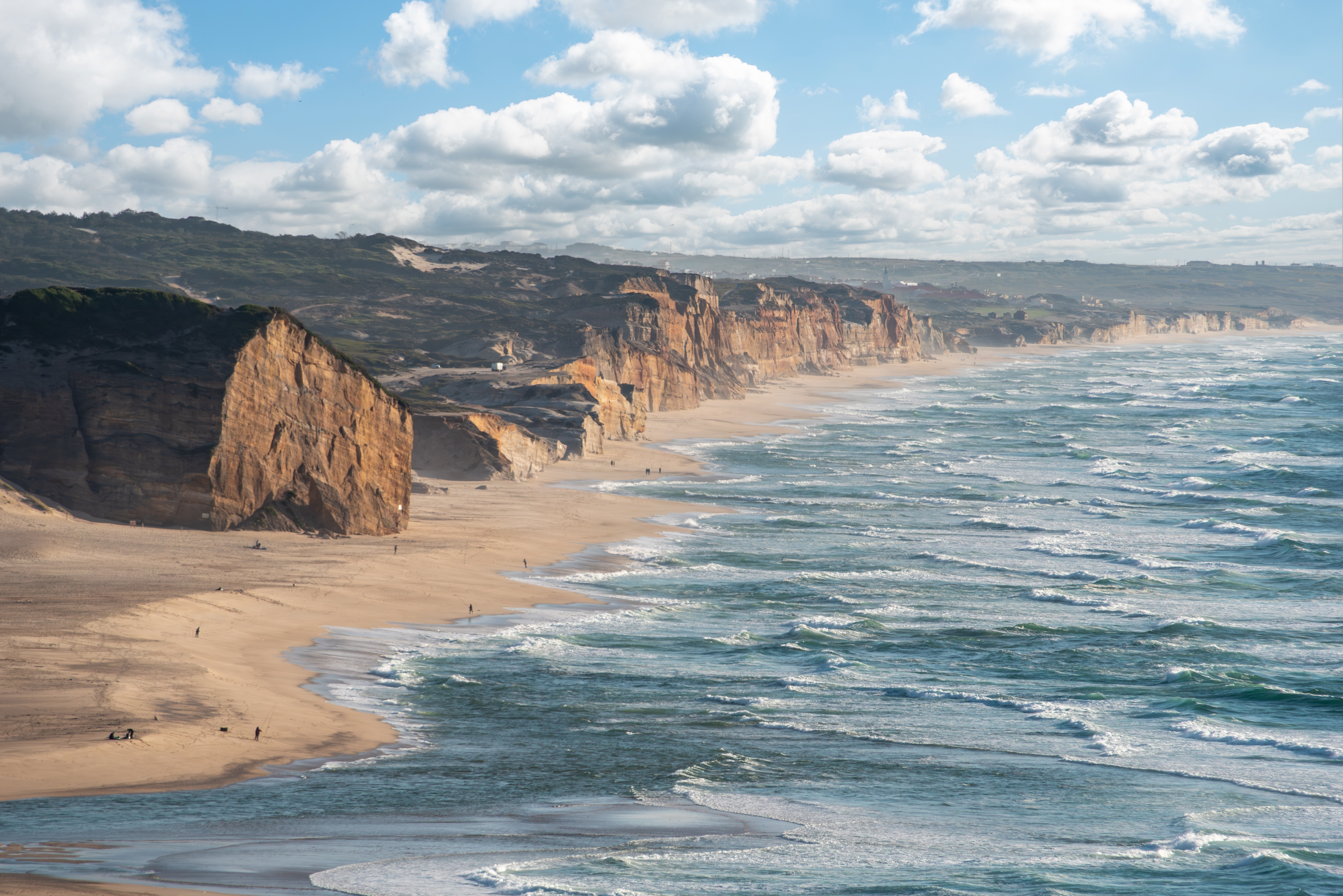 <Die Radetappe verläuft sanft hügelig durch das bäuerliche Landesinnere. Bald darauf schlängelt sich der Radweg schon wieder durch haushohe Dünen Richtung Küste nach Pedrogao. Ehemalige Fischerdörfer mit kilometerlangen, feinen Sandstränden sind heute gemütliche Badeorte. Weiter durch die Sanddünen nach Sao Pedro de Moel, wo die spektakuläre Steilküste für Staunen sorgt. In Nazaré ziehen die weltweit höchsten Wellen die besten und mutigsten Surfer an. Gemütlicher wird’s in Sao Martinho oder Foz do Arelho. Liegen doch beide Orte in einer geschützten Bucht mit vielen kleinen Booten im stillen Wasser.