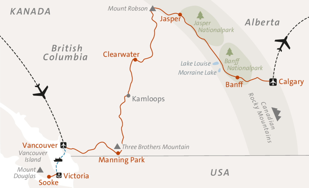 Von Vancouver der schönsten Stadt Kanadas aus führt uns diese Wanderreise erst nach Vancouver Island und endet inmitten der beeindruckenden Bergwelt der Kanadischen Rocky Mountains. Wir wandern entlang von bizarren Canyons, mächtigen Gletschern und malerischen Seen in einer unvergleichlichen Gebirgskulisse. Ohne lange, anstrengende Aufstiege steht bei dieser Reise der Genuss der imposanten und kontrastreichen Landschaft Westkanadas im Vordergrund.