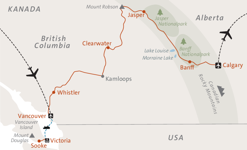 Diese Reise verbindet die Vielfalt und Schönheit Westkanadas in ihrer ganzen Bandbreite: Von Vancouver, oft als eine der schönsten Städte des Landes bezeichnet, führt uns unser Weg zunächst nach Vancouver Island – eine Welt aus Küstenregenwald, schroffen Felsklippen und stillen Buchten. Danach reisen wir weiter ins Landesinnere bis in die beeindruckende Bergwelt der Kanadischen Rocky Mountains. Auf unseren Wanderungen erleben wir die Natur aus nächster Nähe: Wir durchqueren verwunschene Wälder, erkunden bizarre Canyons, bestaunen mächtige Gletscher und genießen die Ruhe malerischer Bergseen. Immer wieder öffnen sich weite Panoramen, die die unvergleichliche Kulisse dieser Gebirgsregion zum Vorschein bringen. Bei dieser Reise genießen wir eindrucksvolle Landschaften, kontrastreiche Vegetationszonen und die wilde, kraftvolle Natur Westkanadas. Ob Küste, Regenwald oder Hochgebirge: Diese Reise zeigt die Vielfalt Kanadas in all ihren Facetten.