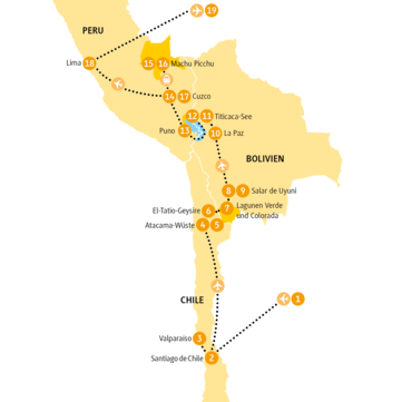 Natürlich platzen sie von Historie und Lebensfreude aus allen Nähten: Santiago de Chile, Valparaíso, Cuzco und Lima. Aber was die Natur dagegengesetzt hat, ist noch hundertmal berauschender: Die Salar de Atacama. Die Geysire von El Tatio. Die Lagunen Verde und Colorada. Den Salzsee Salar der Uyuni. Den Titicaca-See. Und wenn du nach all diesen bewegenden Momenten kaum noch weißt, wo dir der Kopf steht, kommt Machu Picchu. Das Wunder.