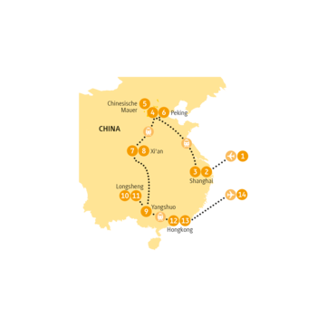 Mit 430 km/h in den Hexenkessel Shanghai. In fünf Bahnstunden 1.300 Kilometer zur Verbotenen Stadt. Garten der Tugend. Die Halle, in der man den Pirolen lauscht. Danach Chinesische Mauer. Xi’an, die alte Kaiserstadt, mit dem Rad auf der alten Stadtmauer entlang. Über 7.000 Soldaten der Terrakotta-Armee. Die sagenhafte Postkarten-Idylle von Yangshuo. Grandioses Finale in Hongkong, mit der Straßenbahn und der längsten Rolltreppe der Welt. Vergisst du nie.