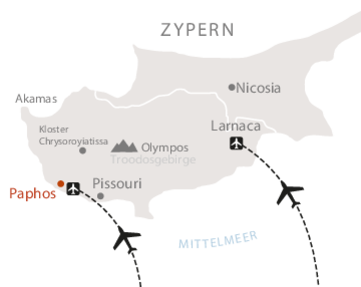 <Morgens um 09:00 Uhr treffen wir uns mit dem ASI Wanderführer zur Begrüßung und zum Kennenlernen an der Rezeption. Bitte für das Treffen bereits in Wanderbekleidung erscheinen. Direkt von unserem Hotel aus erkunden wir die Stadt Paphos. Wir besuchen die bekannten Mosaike im Haus des Dionysos, die Paulussäule und die Königsgräber. Anschließend entdecken wir den Markt von Paphos und kehren genüsslich ein.