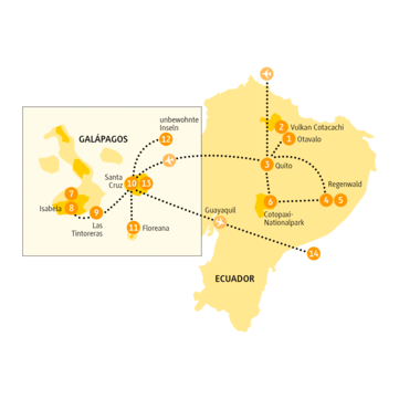 Über 4.000 saftiggrüne Arten bis 60 Meter hoch beherbergt der Regenwald in Ecuador auf einer Fläche von 1,8 Milliarden Hektar. Nichts wie rein und auf keinen Fall das Bäumchen vergessen, das du auf deiner Reise pflanzen wirst. Und doch nur ein Warm Up für die dann folgende Reise in die Urzeit: Sturmtaucher, gelbe Landleguane, Schwarze Echsen, Riesenkrabben, Rotschnabel-Tropikvögel, Blaufußtölpel, die Galápagos-Riesenschildkröte. Die letzten 540 Millionen Jahre auf einmal.