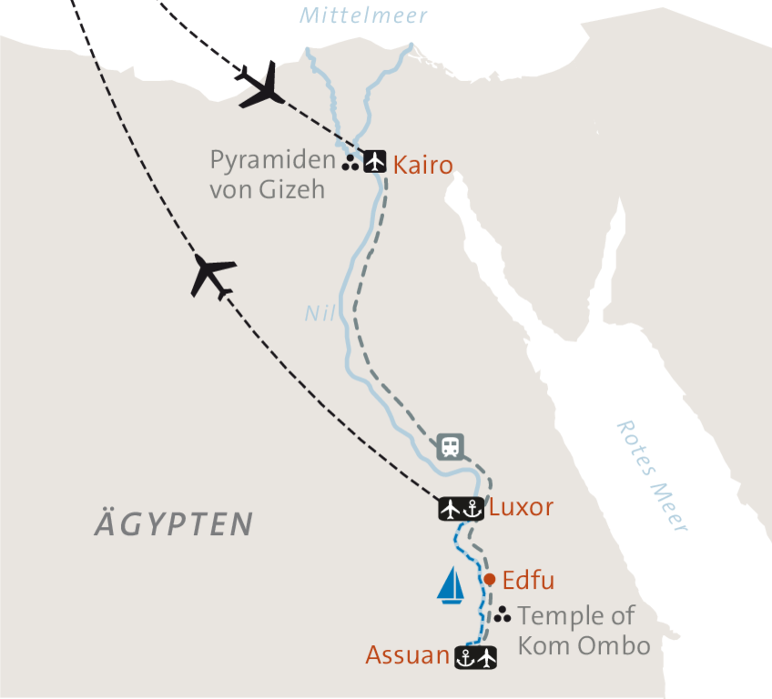 <Mit dem Frühstück im Zug kommt unser Tag in Bewegung: Wir kommen in Assuan an und lassen das Tempo der Schienen hinter uns. Ein Transfer bringt uns zum Nilkreuzfahrtschiff – unser schwimmendes Zuhause. Wir gehen an Bord und stärken uns beim Mittagessen. Kaum sind wir angekommen, ruft der Fluss: Auf einer Felukke lassen wir uns vom Wind tragen und umrunden die Inseln vor Assuan, mit Blick auf Ufergrün und Wasserweiten. Am Abend essen wir auf dem Schiff, lassen den Tag leise ausklingen und übernachten in Assuan an Bord.