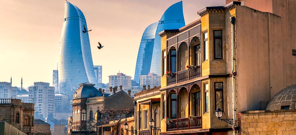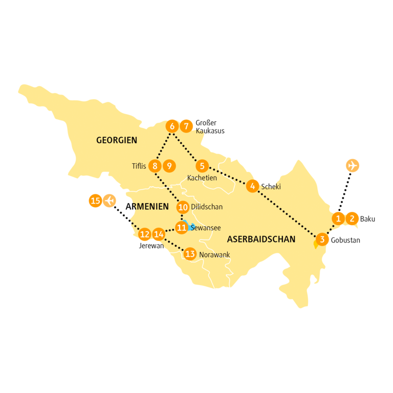 <Heute startet dein Flug ans Kaspische Meer. Nach der Landung in der Hauptstadt von Aserbaidschan erwartet dich bereits deine Reiseleitung und begleitet dich zu deiner Unterkunft. -