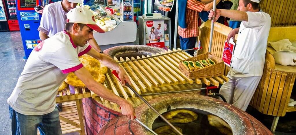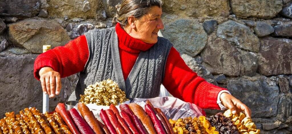 <Deine georgische Reiseleitung erwartet dich gegen Mittag in der Grenzstadt Lagodechi. Hier wechselst du das Fahrzeug und die Fahrt geht weiter in die Region Kachetien im Osten von Georgien, wo dich ein leckeres Mittagessen erwartet. Doch zunächst heißt es erst einmal selbst mit anpacken. Gemeinsam mit der gastgebenden Familie sammelst du frische Kräuter und frisches Gemüse und bereitest daraus einen köstlichen Salat zu. Dazu gibt es Mzwadi, georgisches Schaschlik auf Weinstockspießen, und der hausgemachte georgische Wein darf natürlich auch nicht fehlen. Anschließend besichtigst du die ehemalige Residenz der kachetinischen Könige – die Burganlage Gremi, welche zwischen Weinreben und Wiesen malerischer nicht liegen könnte. Ein tolles Fotomotiv! Wir fahren weiter in das kleine Dorf Kisiskhevi, wo man dich im Schuchmann Wines Chateau bereits erwartet. Freue dich auf eine Führung über das herrschaftliche Weingut mit anschließender Weinprobe. Gut, dass es im Haupthaus auch ein paar Zimmer gibt, in denen du heute übernachtest. Heute überquerst du die Grenze von Aserbaidschan nach Georgien. Zwischen den Grenzposten der beiden Länder liegt ein etwa ein Kilometer langer Weg, den du zu Fuß zurücklegst. Dein Gepäck trägst du dabei selbstständig. -