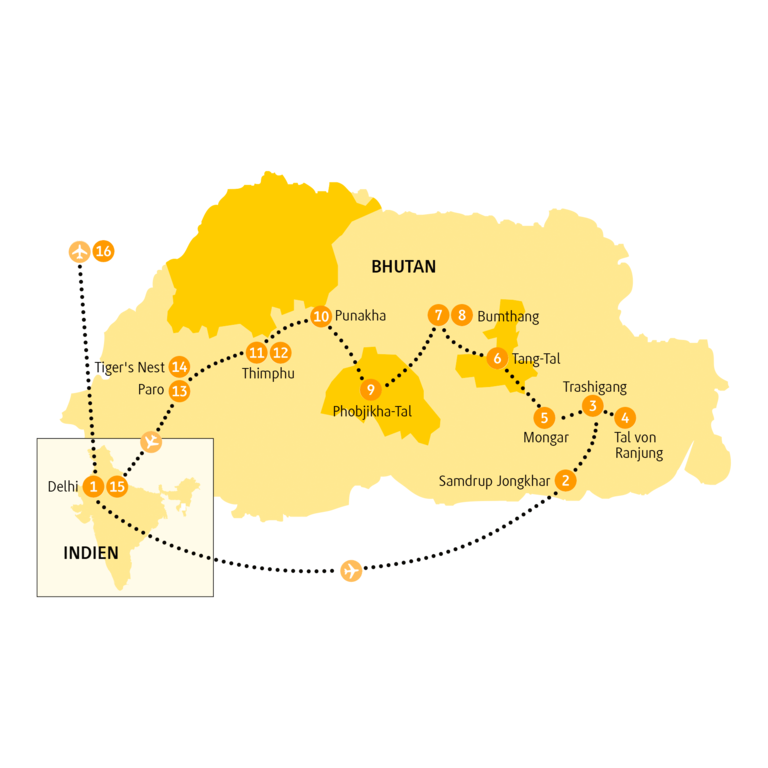<Heute geht es weiter nach Bhutan: Am Morgen fliegst du von Delhi nach Guwahati. Nach der Landung am Mittag wirst du mit einem Lächeln von deiner bhutanischen Reiseleitung empfangen und beginnst die gemeinsame Reise. Zunächst fährst du zur indisch-bhutanischen Landesgrenze. In Samdrup Jongkhar erfolgt die Einreise nach Bhutan und hier verbringst du deinen ersten Abend im Land des Donnerdrachens. An der Grenze zu Bhutan in Samdrup Jonkhar wird von Indien eine Gebühr (stamp fee) von 800 INR erhoben. Diese ist an der Grenze in bar zu entrichten. -