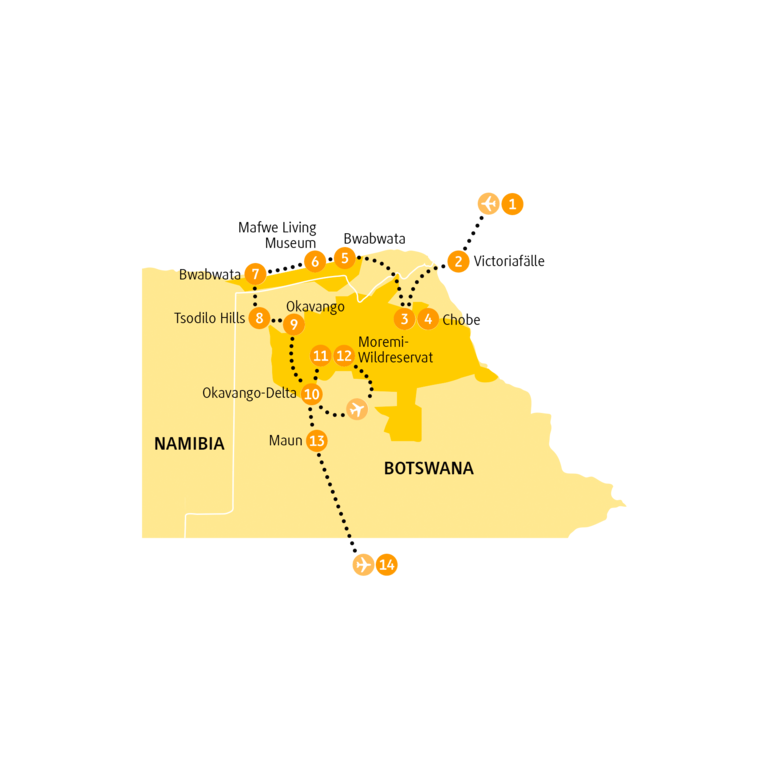 Wasserscheu solltest du auf dieser Reise besser nicht sein. Geht ja schon gut los mit den 10 Millionen Litern der Victoria Falls. Pro Sekunde, wohlgemerkt. Und wenn den Elefanten das Wasser bis zum Hals steht, bist du bereits im Chobe-Nationalpark. Trotzdem nur eine Pfütze gegenüber den Wasserläufen, Lagunen und schwimmenden Inseln im Okavango-Delta. 20.000 qm Weltnaturerbe, übervoll mit Pflanzen und Tieren. Am schönsten trockenen Fußes bei einem Rundflug über das Paradies.