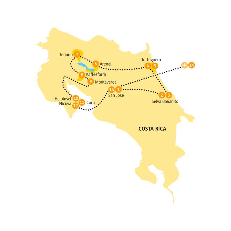 <Grün, grüner, am grünsten – das ist Costa Rica. Los geht´s. Am Flughafen der Hauptstadt San José erwartet dich deine Reiseleitung und bringt dich ins Hotel. Dort kannst du dich nach einer kleinen Stärkung vom langen Flug erholen. -