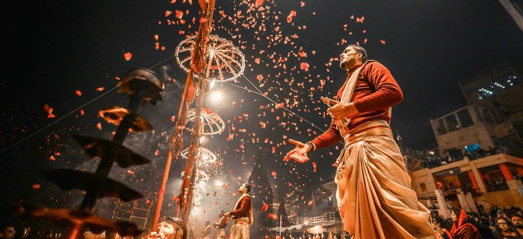 Nach dem Frühstück wirst du zum Flughafen gebracht und fliegst nach Varanasi. Dort angekommen wirst du bereits erwartet und zu deinem Hotel gefahren. Nach dem Check-in bleibt kurz Zeit zum Ankommen, bevor dich Varanasi am Abend mitten hineinzieht in sein Gewimmel aus kleinen Gassen, Stimmen, Düften und Licht. Mit der Rikscha geht es durch die engen Altstadtstraßen rund um die Ghats, wo Mensch und heilige Kuh ganz selbstverständlich denselben Weg teilen. Später wartet ein Gänsehautmoment: die abendliche Aarti-Zeremonie am Ganges. Vom Boot aus hast du einen freien Blick auf die Flammen, Gesänge und Rituale, mit denen der Tag am Fluss verabschiedet wird.
