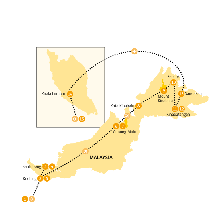 • Inlandsflüge von Kuching nach Mulu, von Mulu nach Kota Kinabalu und von Sandakan nach Kuala Lumpur