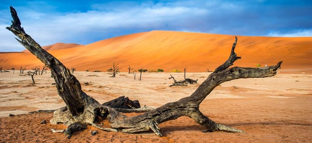 <Es ist noch dunkel, wenn du dich auf den Weg machst zu den gigantischen Dünen am Sossusvlei, die zum UNESCO-Weltnaturerbe gehören. Unterwegs zum Vlei genießt du die morgendliche Stimmung in diesem farbintensiven Dünental. Die letzten fünf Kilometer bis ins Vlei legst du in einem Allradshuttle zurück, da normale Fahrzeuge es mit den Sandmassen nicht aufnehmen können. Du spazierst durch die zauberhafte Dünenwelt und versuchst, einen der bis zu 350 Meter hohen Sandberge zu erklimmen. Sobald du durch das Dead Vlei mit seinen über 500 Jahre alten abgestorbenen Akazien wandelst, weißt du, dass es seinen Namen zu Recht trägt. Falls du bereits am späten Nachmittag in deiner Unterkunft das Meer aus Sand vermisst, greif doch mal in deine Hosentasche oder schau’ in deine Schuhe, wo du sicherlich noch einige rötliche Körner findest. -