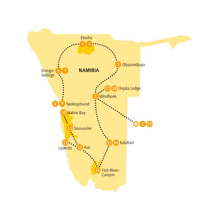<Deine Reiseleitung nimmt dich nach der Landung am Flughafen von Windhoek in Empfang. In Windhoek angekommen, bitten Christuskirche, Tintenpalast und historischer Bahnhof zum Besuch. Während einer Rundfahrt durch den Stadtkern sammelst du erste Eindrücke von Namibias Hauptstadt. Mit malerischen Aussichten auf sanfte Hügel fährst du in das Farmland der Herero in der Otjozondjupa-Region. Bevor die Sonne hinter den Hügeln versinkt, sitzt du schon in der Unterkunft am Swimmingpool. -