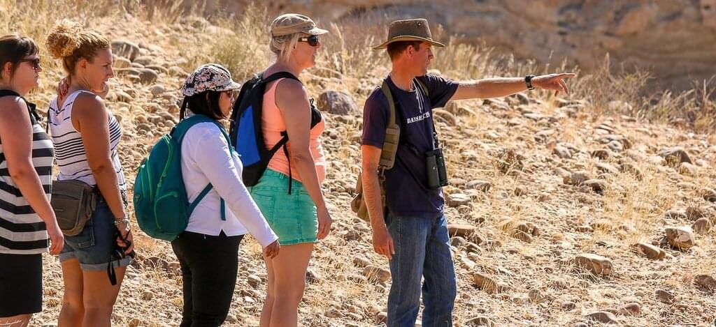 <Eine kurvenreiche Straße führt dich durch die karge Landschaft der Auasberge. Auf der Farm Krumhuk besuchst du die Aris-Grundschule. In entlegenen Farmgebieten sind Einrichtungen wie diese für Kinder von Farmarbeiterinnen und -arbeitern oft die einzige Möglichkeit auf schulische Bildung. Du erhältst einen Einblick in das Schul- und Internatsleben. Mit Rehoboth erreichst du die Heimat der Baster, einer Gruppe von Nachkommen der Khoikhoi und weißen Siedlerinnen und Siedler. Weiter geht es über den Remhoogte-Pass zu deiner Lodge. Am Nachmittag unternimmst du eine Wanderung am Fuße der rot leuchtenden versteinerten Dünen. -