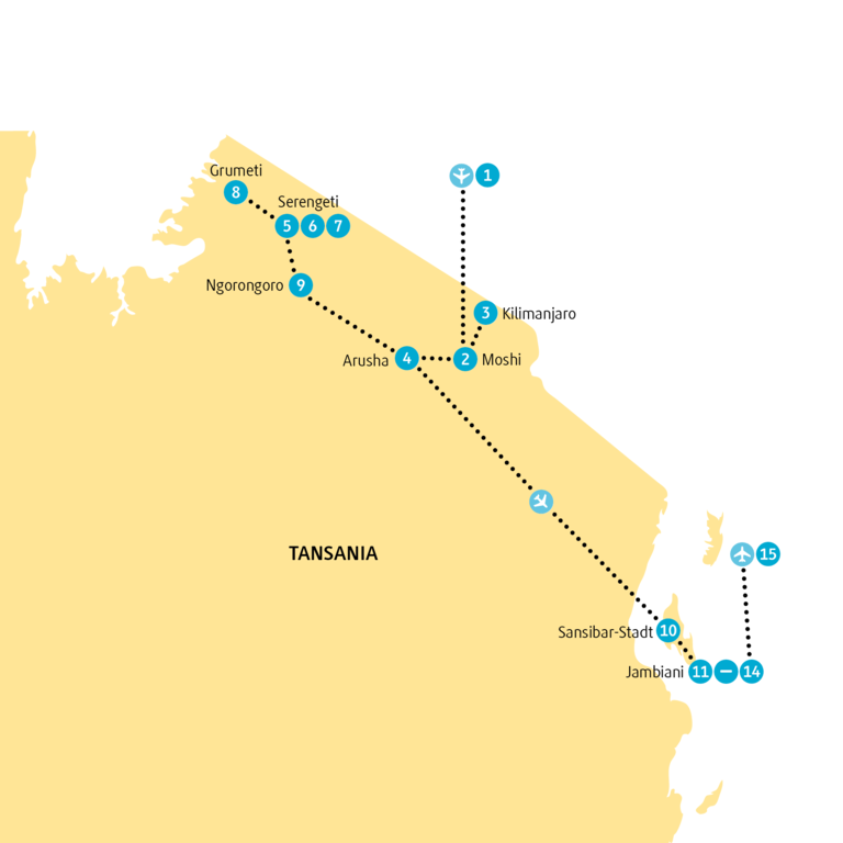 <Die erste Safari deiner Afrikareise steht auf dem Programm. Wir fahren in den Arusha-Nationalpark, und deine Freude über die ersten Antilopen wird grenzenlos sein. Aber auch Zebras, Giraffen und Büffel leben in dem Park, und mit etwas Glück siehst du sie alle bereits heute. Und wenn nicht, halb so wild – dir bieten sich auf dieser Reise noch viele, viele weitere Möglichkeiten, Tiere zu beobachten. Einen ganz anderen Blickwinkel bekommst du bei unserer Wanderung im Arusha-Park. Falls dir ausgerechnet jetzt eine Giraffe über den Weg läuft, wird sie dir gleich doppelt so groß vorkommen. Der 4.566 Meter hohe Mount Meru bietet übrigens die perfekte Kulisse für Fotos. Am Nachmittag erreichen wir unser Hotel. Bist du Kaffeefan? Dann schau dir während unseres Rundgangs über die hoteleigene Kaffeeplantage genau an, wie die Bohnen für deinen Lieblings-Muntermacher angebaut werden. -