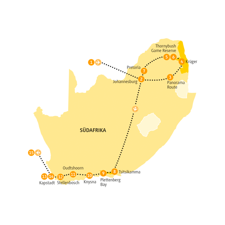 Von oben rechts bis unten links, dann hat man die wilde und die charmante Seite von Südafrika in einem Rutsch. Wild, das ist die Panorama-Route zum atemberaubenden Blyde-River-Canyon. Wilder der Krüger-Nationalpark. Am wildesten die Big Five im im Thornybush Game Reserve. Dann der Charme: Garden Route, der ungezähmte Tsitsikamma-Nationalpark, die blaue Lagune von Knysna, die Traumstrände von Plettenberg Bay, die Wineyards von Stellenbosch. In Kapstadt allerdings geht es wieder richtig zur Sache.