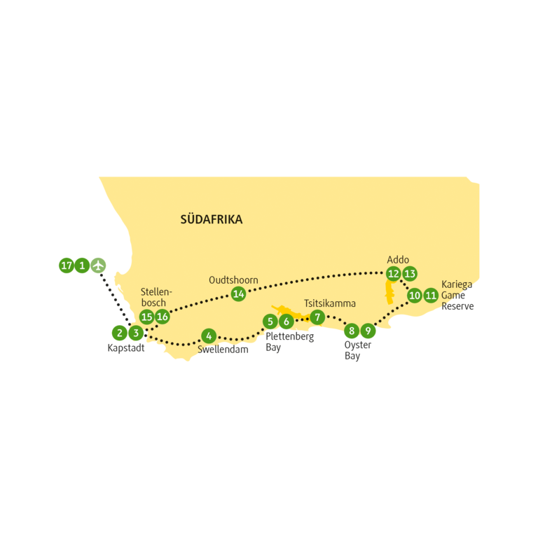 Genau genommen müsste es Big Fifteen heißen, denn zu den fünf Stars der Tierwelt kommen die seligen Weinlagen von Paarl, die berühmte Route 62, die schönste Stadt in der schönen Karoo, das Straußeneldorado Oudtshoorn, der Addo- Elephant-Nationalpark, die Safari-Abenteuer im Kariega Game Reserve, die äußerst schmackhafte Oyster Bay, der Wunderwelten-Nationalpark Tsitsikamma, das Badewasser der Plettenberg Bay und viiiiiiel Zeit für die Lebenslust von Kapstadt noch hinzu.