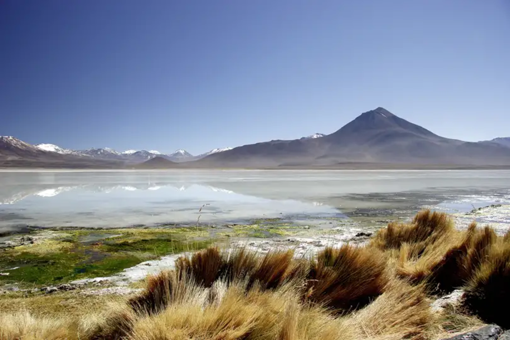 Bei einem Tagesausflug entdecken wir den riesigen Salar de Atacama im Süden. Unser erster Stopp ist das verschlafene Dorf Toconao mit seiner malerischen Kolonialkirche. Hier wird noch handgemachtes Kunsthandwerk verkauft und viele der Einwohner leben mitten in der Wüste vom Obstanbau. Wir besuchen den grünen Jerez Canyon westlich vom Dorf, wo die fruchtbaren Gärten gepflegt werden und ein Gebirgsbach Abkühlung spendet. Von hier fahren wir auf holprigen Straßen mitten auf den Atacama Salzsee, um die Laguna Chaxa im Reservat Las Flamingos zu besuchen. Die namensgebenden Vögel finden in dem schimmernden Wasser ihre natürliche Futterquelle und können aus nächster Nähe beobachtet werden. Unsere Fahrt bringt uns weiter hinauf zu den Hochlandlagunen Miscanti und Miñiques. Auf 4.200 m Höhe schlendern wir geruhsam von einem See zum anderen und können, um den perfekten Blick auf das dunkle Wasser, die weißen Mineralablagerungen, die gelbliche Pflanzenwelt und die schneebedeckten Vulkane im Hintergrund einzufangen.