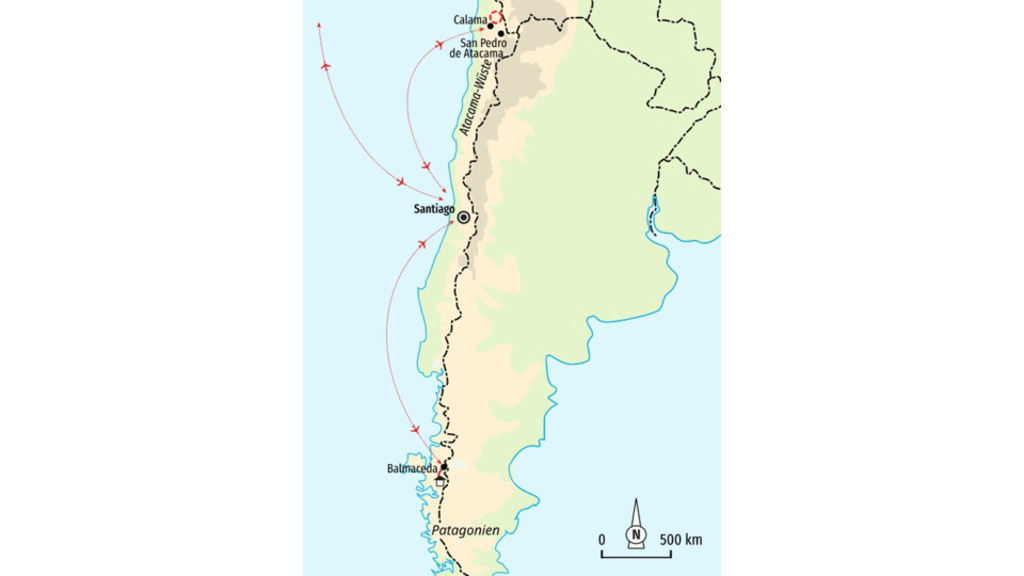 Trekkingreise durch die Atacama-Wüste und durch die Einsamkeit PatagoniensKaum ein anderes Land vereint so viele landschaftliche Gegensätze wie Chile. Wir erkunden die Schönheiten im schmalsten Land der Welt von Nord nach Süd: von der kargen Atacama-Wüste über die Weinbaugebiete im Zentrum des Landes bis in die wilde, einsame Bergwelt Patagoniens. In der Wüstenoase San Pedro de Atacama wandern wir beim Sonnenaufgang zwischen Sanddünen und frühstücken neben den sprudelnden Tatio-Geysiren. Wir trekken durch fruchtbare Schluchten und waten durch kleine Bäche. Im Altiplano werden wir von Lamas und Alpakas begrüßt und haben einen einmaligen Panoramablick über den von Flamingos bevölkerten Atacama-Salzsee in die Weite der Wüste. Szenenwechsel: Ein frischer Wind bläst uns entgegen und heißt uns in Patagonien willkommen. Fernab der Zivilisation übernachten wir in der Terra Luna Lodge am Rande des riesigen, in Blau-und Grüntönen glänzenden Lago General Carrera. Umgeben von schneebedeckten Gipfeln gleiten wir mit dem Boot den Lago Leones entlang, bis wir die zerklüfteten, blau-schimmernden Gletscherfelder erreichen.