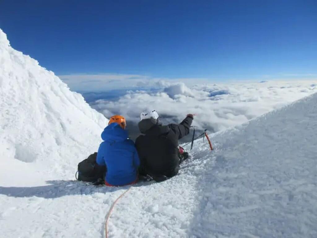 <Wir stehen um Mitternacht auf und bald schon geht es los. Beim Gletscher ziehen wir die Steigeisen an und seilen uns an. Auch wenn der Vulkan technisch nicht anspruchsvoll ist, überrascht er durch seine ständige Steilheit. Es gibt kaum flache Stellen und man spürt die große Höhe. Kurz nach Sonnenaufgang erreichen wir den Gipfel und aus dem Krater sieht man Schwefeldämpfe aufsteigen, die man auch riechen kann. Bei gutem Wetter sehen wir alle hohen Schneeberge Ecuadors und die Aussicht lässt die Mühen schnell vergessen. Der Abstieg erfolgt auf derselben Route und nach einer kurzen Rast auf der Hütte packen wir zusammen und fahren nach Quito ins Hotel. -