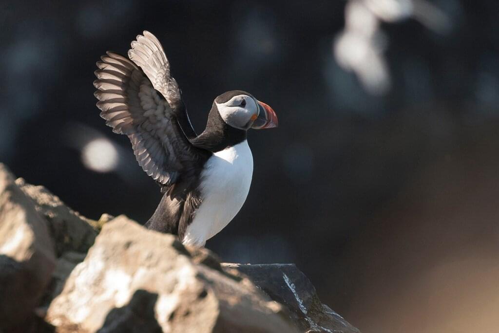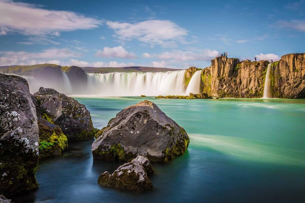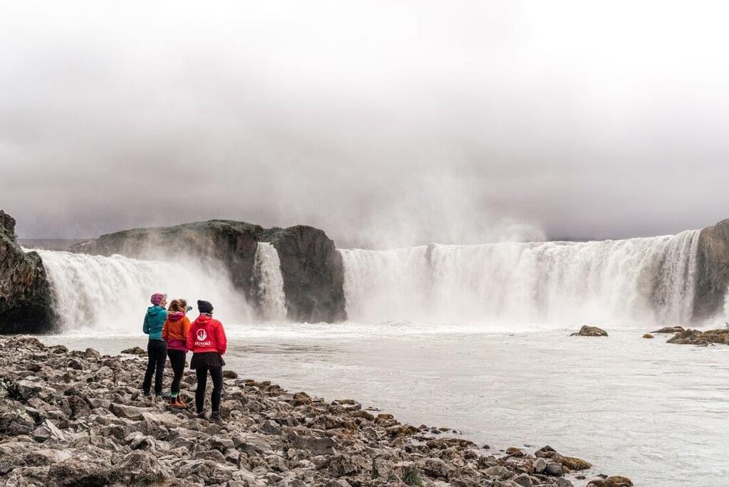<Drive around the Trollaskagi Peninsula and visit the small fishing town of Siglufjordur. Explore the town centre, dwarfed by towering mountains on three sides with the fjord on its north. Further along the coast you’ll have the opportunity to dip your toes in the Arctic Ocean before an Icelandic schnapps tasting, accompanied by some local delicacies – think shark, lamb’s head, liver sausage and dried fish. Continue to Hauganes, where you’ll get to know the gentle giants of Iceland’s waters on board a carbon neutral whale watching tour. Minke and humpback whales are commonly spotted in these parts, and the boat keeps a respectful distance from the whales, allowing you to observe them in their natural environment without disturbing or distressing them. You’ll be joined on board by an expert whale watching guide who will help to spot these beautiful creatures while providing insight on their lives and habitats in Arctic waters. Continue to the town of Akureyri and head out for a leader-led orientation drive when you arrive. Next, drive to the mighty waterfall of Godafoss, also known as The Waterfall of the Gods, before continuing to your hotel in Husavik.