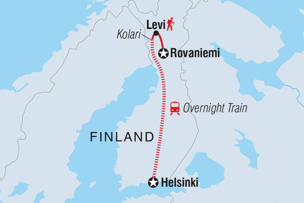 <After an exciting train journey, you'll disembark this morning in Kolari where a transfer will be waiting to take you to your accommodation in Levi. There will be some time to rest and recharge before joining your leader in the afternoon for a gondola ride and short guided walk to explore the surroundings and beauty of the midnight sun. Tonight, why not continue to explore Levi and find somewhere to try some local dishes for dinner.