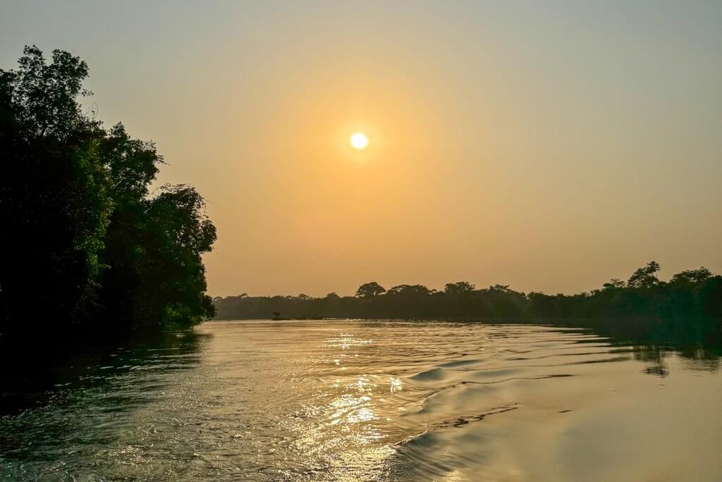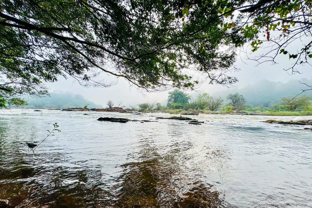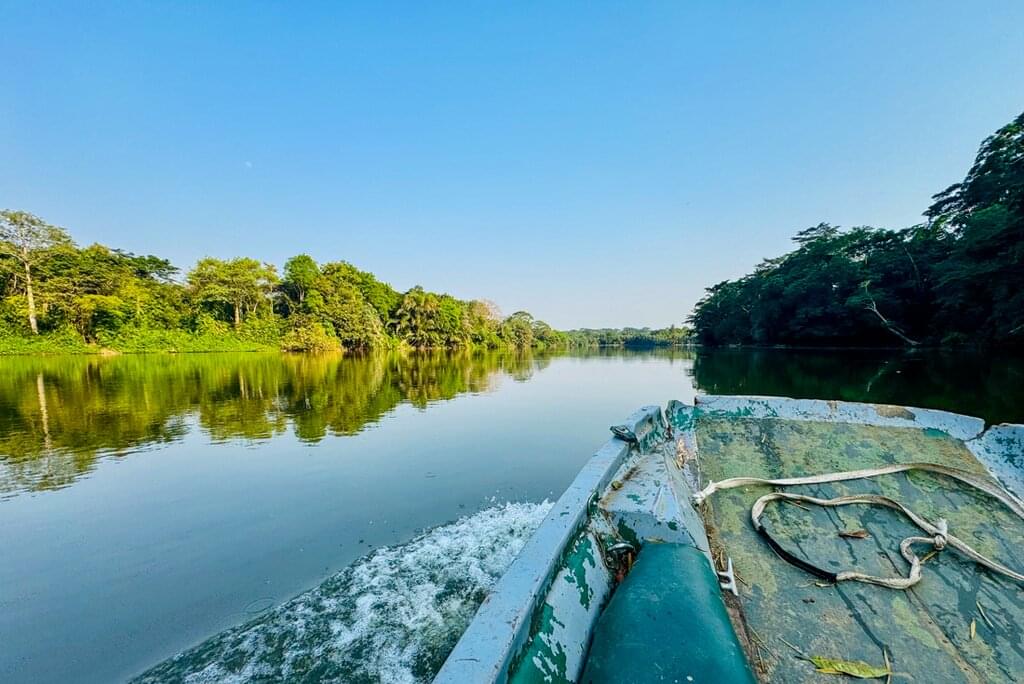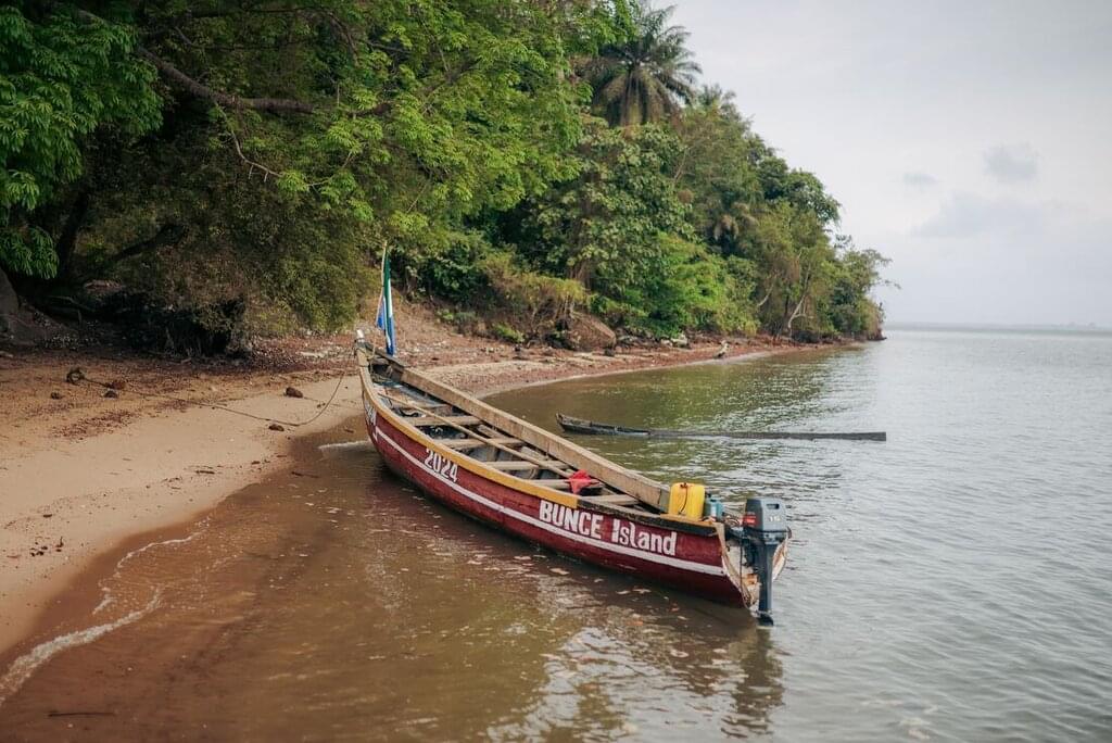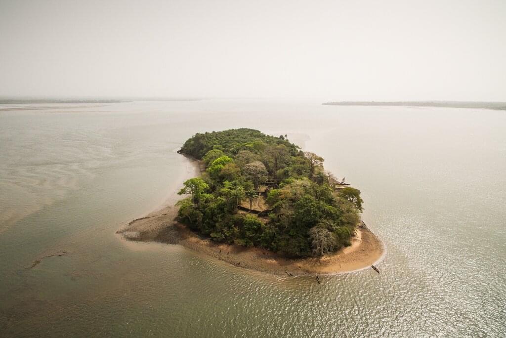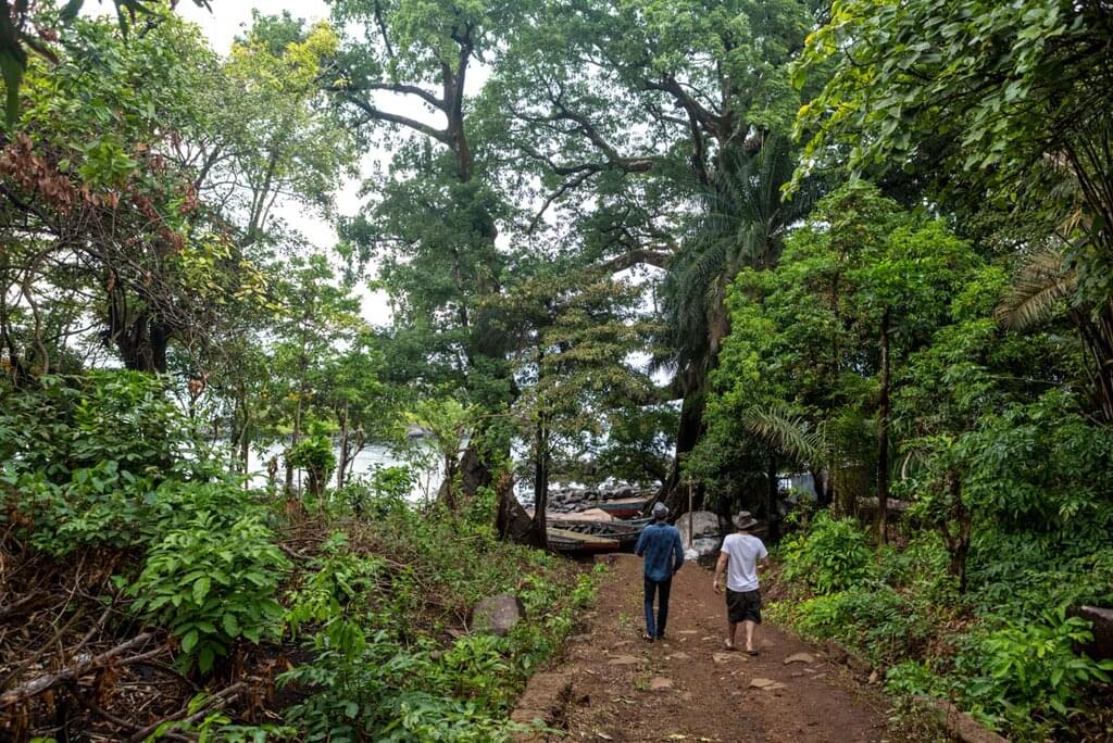 <Travel to Tiwai Island, a community-led wildlife sanctuary known as the “Land of the Apes.” The island is home to chimpanzees, colobus monkeys and other species, though sightings are rare due to the impact of past hunting and conflict. What makes Tiwai special is the sense of wilderness: towering trees, dense forest and the feeling of being far removed from the outside world. This afternoon, take in the scenery on a boat cruise along the Moa River before joining a community-led night walk through the forest to experience the island after dark.