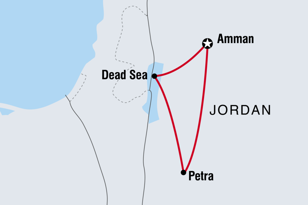 <Ahlan o Sahlan! Welcome to Jordan. Your Short Break Adventure starts at 10 am when you’re picked up from your hotel in Amman and drive to Mt Nebo. When you’ve admired the Byzantine mosaics and the great views (which, on a clear day, extend all the way to the Palestinian Terriroties and Israel), you’ll head to the Dead Sea. Here, at the lowest point on Earth (420 m below sea level), the water is seven times saltier than the ocean. This means you’re extremely buoyant when swimming and will float on the water rather than in it. The mud here is said to have healing properties, and many visitors like to cover themselves from head to toe. Stop at a private beach with less salty pools and a gentle slope to the water – don't forget to pack your swimwear today! After lunch, drive to the mountains of Petra, where you’ll spend the night.