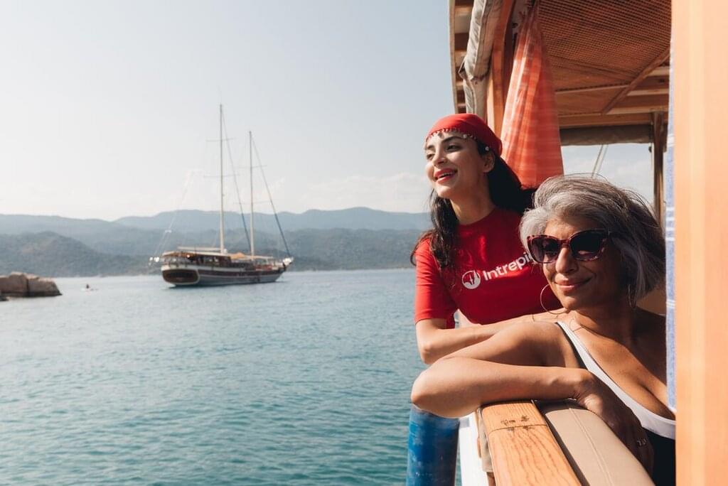 <Hoş geldin! Welcome to Turkey. Your adventure begins in Bodrum – home to white-washed Mediterranean houses, cobblestone streets and high-end shopping that make this city one of Turkey's best retail destinations. If you arrive early, explore the twin bays at your own pace – boasting views of the iconic Bodrum Castle – a medieval fortress that was partly built with stones from the Mausoleum at Halicarnassus, one of the Seven Wonders of the Ancient World – there's plenty to do and see here! At 4 pm, you’ll board your beautiful Turkish gullet (a classic wooden yacht from the southwest coast of Turkey). After a welcome meeting to meet your fellow travellers, you’ll have a briefing on what to expect over the next eight days of living on the boat. Then, sail to Black Island. When you arrive, why not jump into the crystal-clear waters for your first swim of the trip. Have dinner as a group and spend your first night aboard, falling asleep to the gentle rocking of the waves.