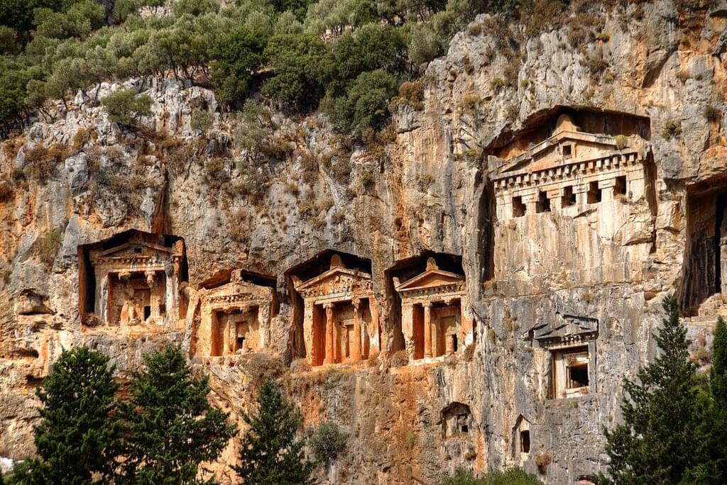 <Sail towards Ekincik this morning – naturally beautiful, this village boasts a 2 km stretch of gravel beach surrounded by local wildlife. When you arrive, head out for a swim and a spot of snorkelling. Later, if you like, you can opt for an excursion to Dalyan – this small village sits within pine-covered hills, cotton fields and unspoiled coastline. Take a piyade (a small riverboat) to Turtle Beach, soaking in the natural beauty of the delta along the way. Stop for a swim at the beach – this is where the endangered Loggerhead Turtles lay their eggs during nesting season (May to October)! After a dip in the ocean, make your way to the ancient city of Kaunos – this UNESCO World Heritage site is home to ancient Rock Tombs, which were carved into the cliffs 2500 years ago. End the day at the nearby mud baths, where the warm, sulfur-rich water will work wonders on your skin, leaving you soft and rejuvenated. Later, have dinner on board.
