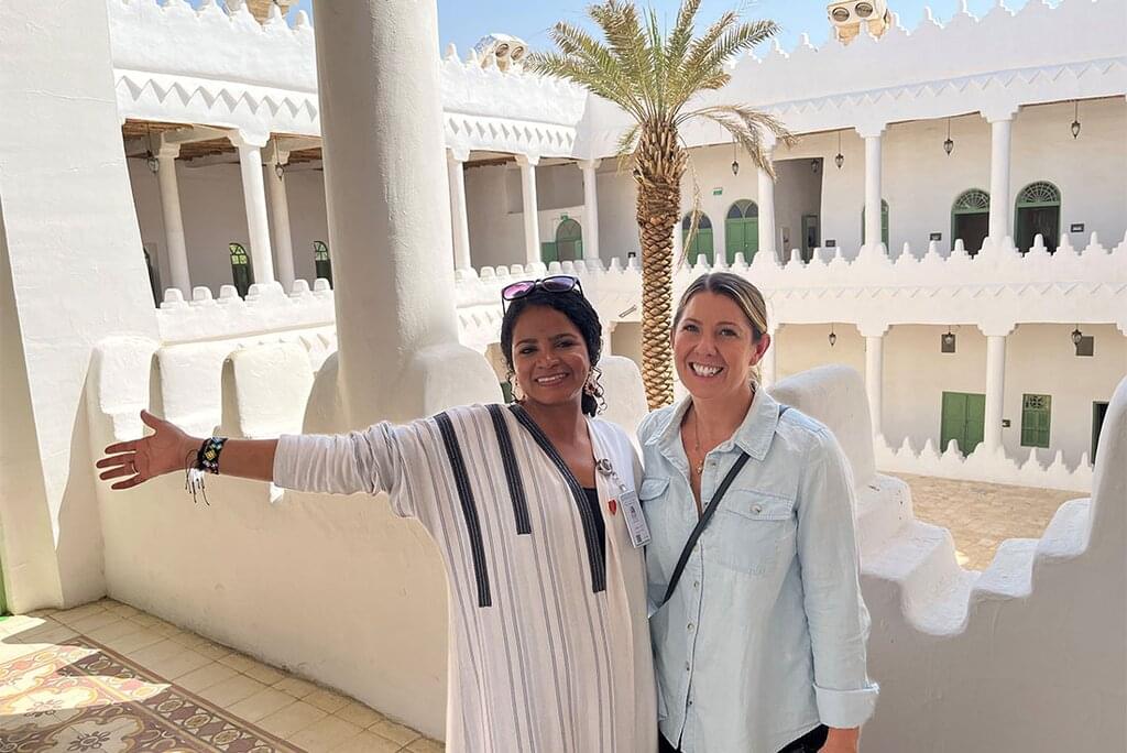 <After breakfast, you’ll hit the road. On the way to Buraydah, stop at the small town of Al-Ghat – one of the largest and best-preserved traditional villages in Saudi Arabia. Learn about the Najdi architecture and the historical significance of this ancient oasis town, which once served as an important centre of the Saudi state. Visit Qasr Al-Imarah (Amara Palace), a 19th-century emirate palace with 50 rooms built around a central courtyard, complete with a small mosque and adjoining residences. Then sit down to a traditional Najdi lunch, prepared as part of a project supporting local women through training and employment. After lunch, with farm views, you’ll continue to Buraydah. This evening, visit the Old Market – a living museum of Najdi heritage, where traditional crafts, clothing, aromatic coffee and 140-year-old homes sit side by side.