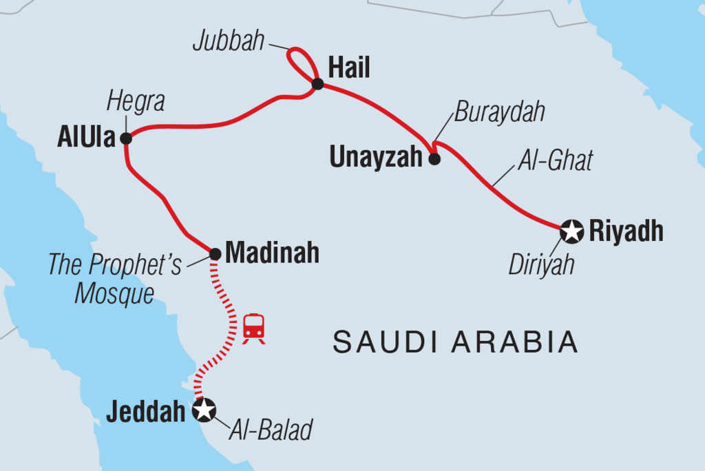 <Salam! Welcome to Saudi Arabia. Your adventure starts with a 6 pm welcome meeting in Riyadh – the birthplace of modern Saudi Arabia. Once a walled, mud-brick wallalong desert trading routes, this capital is now a contemporary metropolis with more than 4000 mosques, shopping centres, palaces, museums and traditional souq. If you arrive early maybe explore one of the mosques, wander through the National Museum or visit Kingdom Tower. Tonight, maybe head out for dinner with your group.