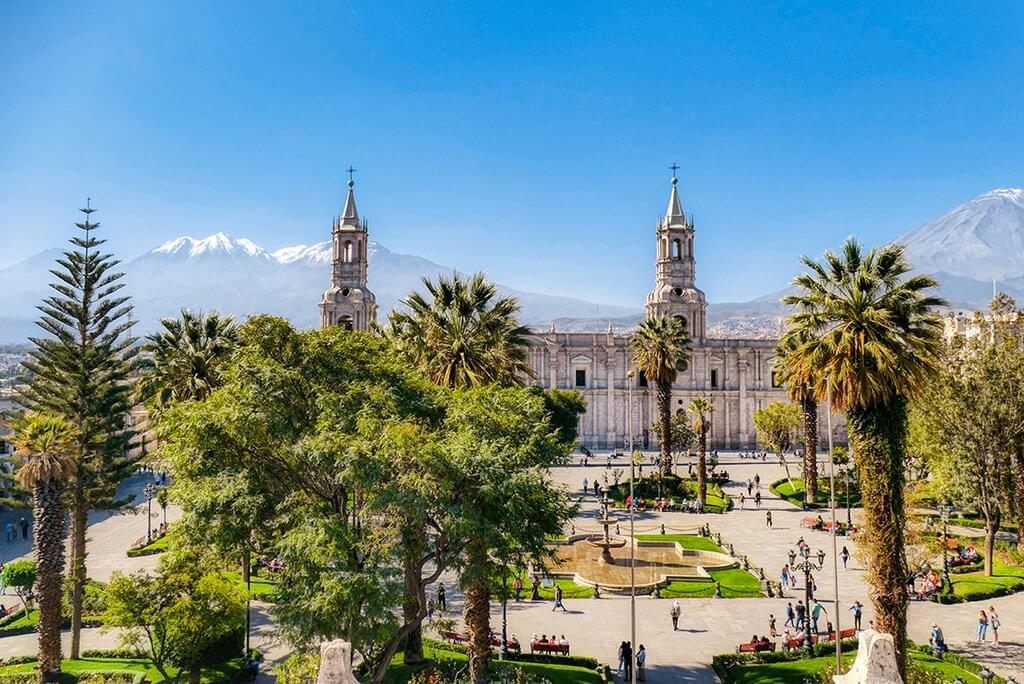 <Leave Nazca behind this morning and travel to Arequipa in a private vehicle. Standing at the foot of El Misti Volcano and filled with baroque buildings, Arequipa vies with Cusco for the title of Peru's most attractive city. Built out of a pale volcanic rock called sillar, the old buildings dazzle in the sun, giving the city its nickname – the 'White City'. Upon arrival, maybe take a stroll to stretch your legs after a long driving day – the main plaza, with its cafes and nearby cathedral, is lovely to wander.