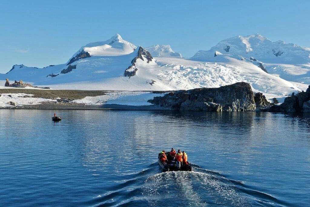 <Today is all about immersing yourself in the striking landscapes of the South Shetland Islands. The distinctive geology of these islands has been shaped by volcanic activity over time. You’ll spend today on a Zodiac cruise, exploring the landscapes of mountains and glaciers teeming with wildlife that make up this archipelago. After the long winter, the wildlife here is now back in full force. Encounter chinstrap and gentoo penguins, whales and elephant and fur seals. You might even stop at Deception Island for a walk along the black sand. This island, formed by the crater of an active volcano, is peppered with the ruins of a Norwegian whaling station and scientific bases from the 1960s. -