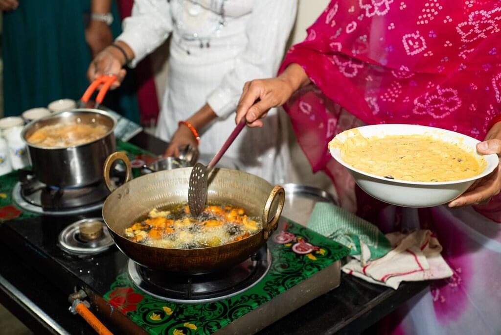<Heute Morgen fahren Sie zum Dorf Deogarh. Nach Ihrer Ankunft beziehen Sie Ihr Zimmer im Deogarh Mahal, einem beeindruckenden Palast aus dem 17. Jahrhundert, der heute ein Hotel mit Blick auf die Aravalli-Hügel und die umliegenden Seen ist. Ursprünglich als Residenz und Festung der Rawats (Mewar-Adel) erbaut, hat das Deogarh Mahal seinen königlichen, historischen Charakter mit gewölbten Dächern, verzierten Balkonen und großen Torbögen bewahrt und bietet gleichzeitig modernen Komfort unter der Leitung derselben Familie. Am Nachmittag unternehmen Sie einen Spaziergang durch das Dorf, bevor Sie zum Hotel zurückkehren, um an einem Kochkurs teilzunehmen. Lernen Sie die Zubereitung traditioneller lokaler Köstlichkeiten nach authentischen Rezepten und mit Techniken, die von Generation zu Generation weitergegeben wurden.