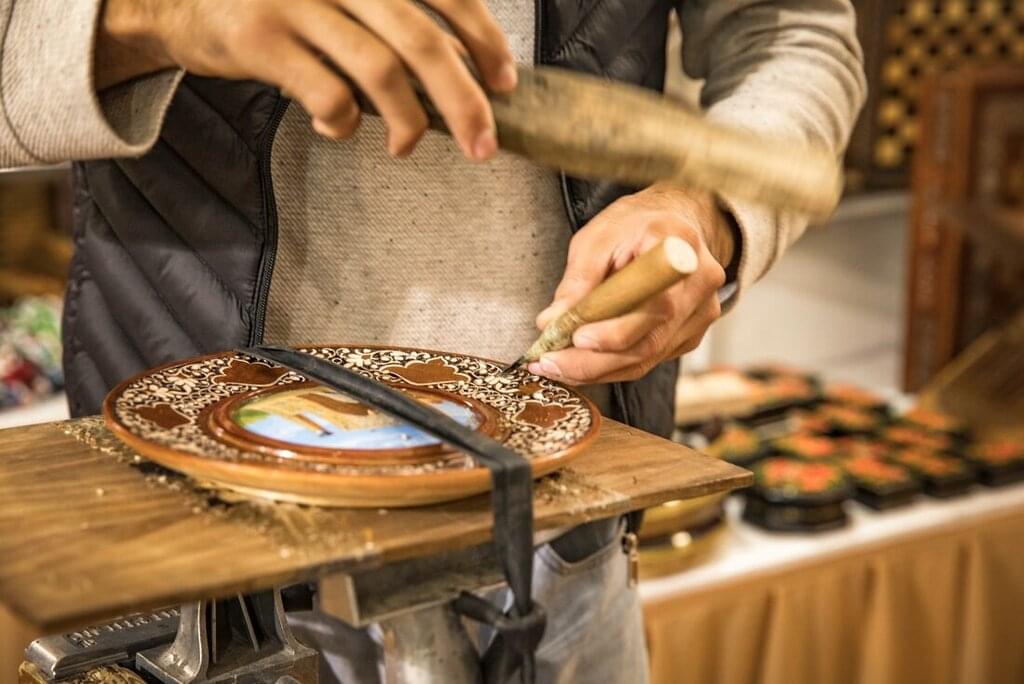<Early this morning, take a high-speed Afrosiab train to the ancient Silk Road hub of Samarkand. The city has long been a centre of artisans and traders as well as the prize for many a conquering army, leaving behind a rich and complex history. When you arrive, stop by the gorgeous remains of the Ulugbek Observatory – built by a Muslim prince, your leader will explain how this unpopular ruler had a controversial passion for astronomy. After, explore the Afrosiab Museum – home to a treasured 7th-century fresco of the Sogdian King Varkhouman. Then, head to the workshop of a local artisan in Konigil to discover one of the few people in Central Asia who continues to produce paper using a 1000-year-old method. This village is home to the Meros paper mill, founded by well-known masters, the Mukhtarov brothers. Thanks to their efforts, the local factory revived an ancient tradition based on old Samarkand technologies. You'll also see a ceramics workshop, then you can enjoy a free evening to explore Samarkand at your own pace.