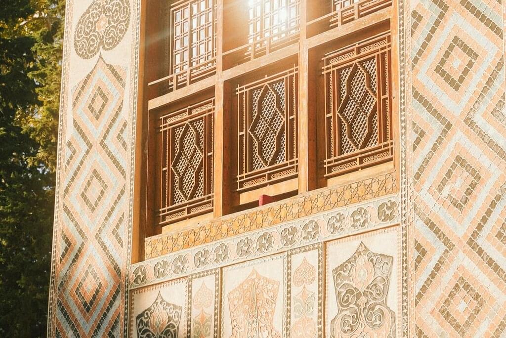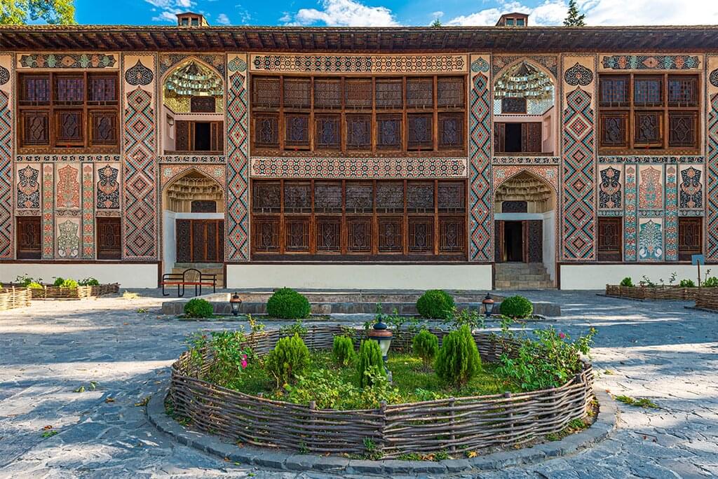 <Visit the Palace of Sheki Khans first in the morning. The walls of the palace are painted with scenes of hunting and war and it features impressive stained glass. Afterwards check out a workshop where shebeke – stained glass windows made with no glue or nails – are produced by local masters witih skills past down through generations of practices. Then get on a local public bus to Kish to visit the pointed spires of a church that is among the oldest in Christendom, believed to be around 1700 years old. The rest of the afternoon is free for you to discover Sheki. Why not explore the impressive traditional architecture on foot. Maybe stop for tea and some local halva (made with sugar, hazelnuts, coriander and rice flour grinned in a watermill). -