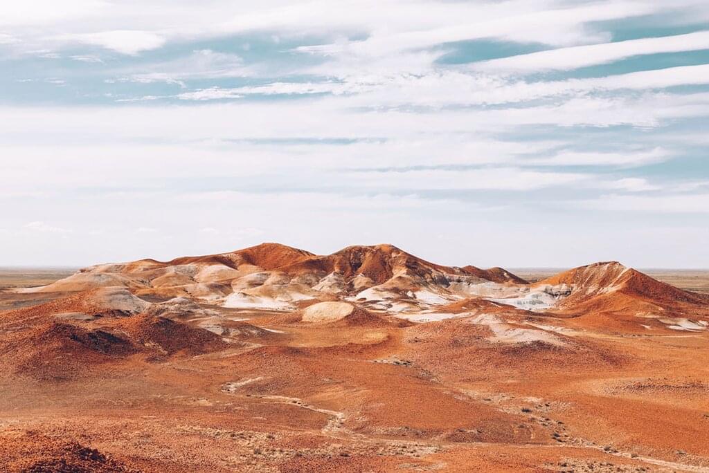 <Have breakfast at a café in town before driving to Woomera – a town that was purpose-built for testing rockets in the 1940s. Learn about nuclear and non-nuclear rocket testing at the Woomera Heritage Museum & Visitor Information Centre. There will be time for lunch before the short drive to Lake Hart Rest Area for views of one of the region’s salt lakes. When you arrive in Coober Pedy, perhaps stroll around town, search out some street art or find a local bar. You are in the opal capital of Australia, so maybe go jewellery hunting for the perfect souvenir. Tonight, maybe join your group for dinner at a local bar that offers up incredible views of the Breakaways and Coober Pedy.
