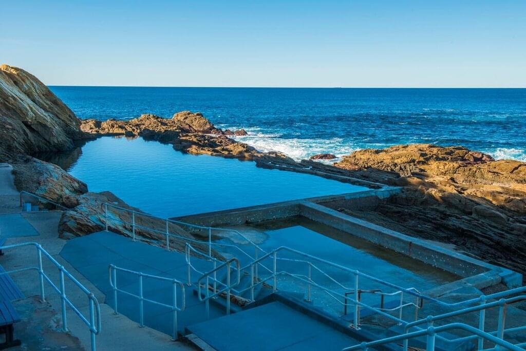 <Begin today with an oyster tour on Pambula Lake near Merimbula. Here, you’ll see how Sydney rock oysters are sustainably farmed using modern aquaculture techniques and learn about the area’s geology from a local oyster farmer. After, you can taste some of the fresh shellfish caught along the way! Stop for lunch at the Merimbula Wharf Restaurant before continuing to Bermagui Blue Hole. When you arrive, walk down the cliff to the 50 m long seawater swimming hole, known for its sapphire-blue water and marine life, like sea stars, crabs and marine snails. Maybe dive into the pool or walk to the viewing platform and soak in the views over the pool and surrounding coast. Continue to your overnight accommodation in Jervis Bay.