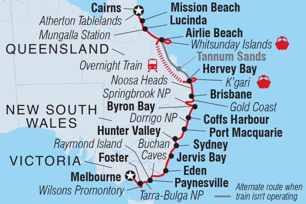 Explore the wilderness and spot wildlife on a 20-day adventure from the iconic cityscape of Melbourne to Queensland’s capital of Brisbane. Take the ferry to Raymond Island and see koalas in their natural habitat, walk the Corrigan Suspension Bridge Loop through a rainforest that dinosaurs used to roam. Venture through the Hunter Valley – one of Australia’s most popular winery regions and visit some cute and cuddly koalas in an animal hospital near Port Macquarie. Take an off-road adventure across the undulating dunes of K'gari (formerly Fraser Island), snorkel through the tropical waters of Whitehaven Beach, flop and drop on the palm-fringed sands of laidback Mission Beach.