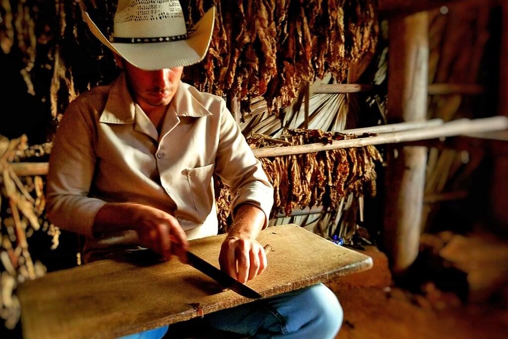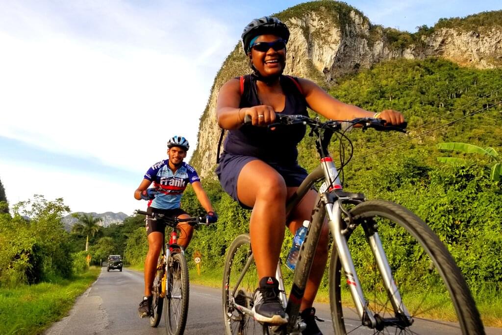 <Drive to the hilly Cueva de los Portales, where the legendary Che Guevara stayed and trained the Western Army of the Cuban Revolution. From here, cycle on to the UNESCO-listed town of Vinales. Set among low-lying mountains, this beautifully remote area is reminiscent of the limestone karst scenery of Vietnam and is the perfect place to ride with very little traffic on the roads. Push your pedals a short distance uphill and be rewarded with spectacular views before continuing on to meet the delightful Mama Luisa – a seasoned farmer who will treat you to a delicious local meal. After, ride to a tobacco farm where you’ll meet another farmer who’ll show you how tobacco is dried and then rolled into cigars – here you have the chance to purchase this Cuban speciality directly from the maker. Jump back into the support vehicle and return to Vinales in time for a farm-to-plate experience at a hillside restaurant. The food here is 100% organic and grown locally, and although drinks aren’t included, you only pay for the mixers as the rum is free!