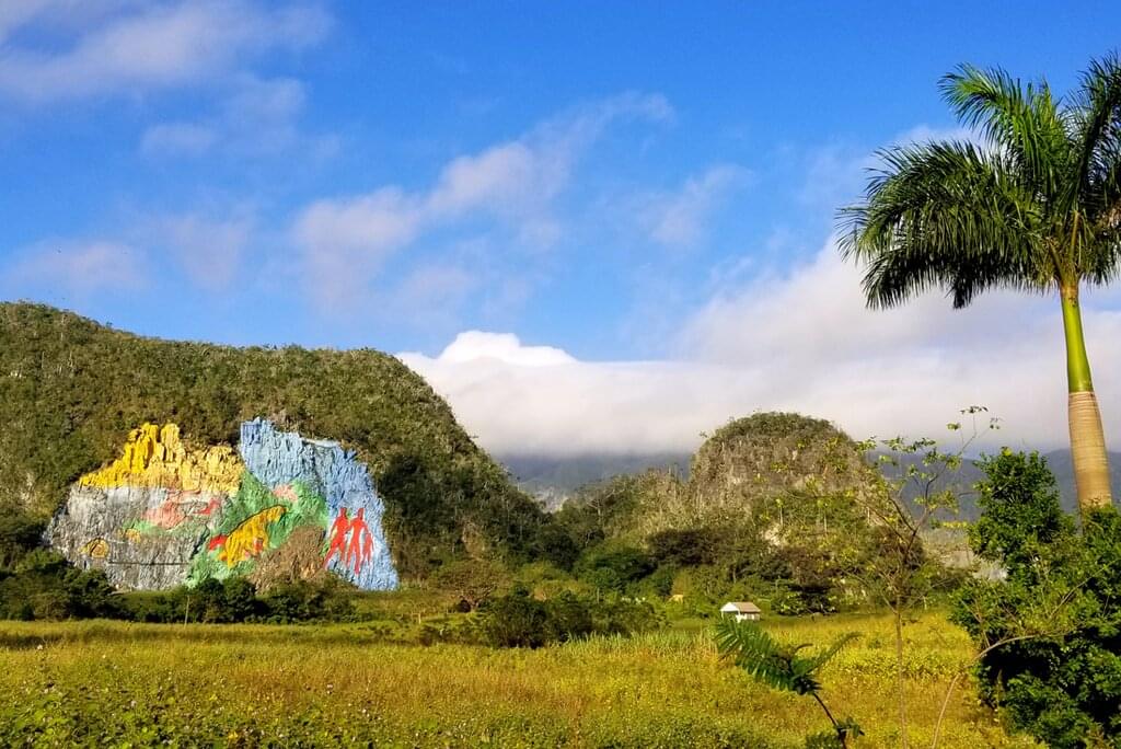 <After breakfast, drive to the Diego Rivera-inspired Mural de la Prehistoria. Painted on a cliff at the foot of the Sierra de Vinales, the huge eye-catching mural took 18 people four years to finish. From here, leave the towering limestone karsts behind as you cycle to Cayo Jutias, traversing smaller roads through dry and flat farmland, with barely a vehicle to be seen, until you reach white beaches and pale blue water. After your ride, stretch out on the shoreline and sit down for a packed lunch with fresh juice. Then, enjoy some free time to relax – swim in the warm waters or walk to the neighbouring beach where the locals often park their old cars on the sand. After some time to soak up the atmosphere, take the support vehicle back to Vinales. The rest of the evening is free – why not try one of the many live music venues or salsa the night away ata dance class.