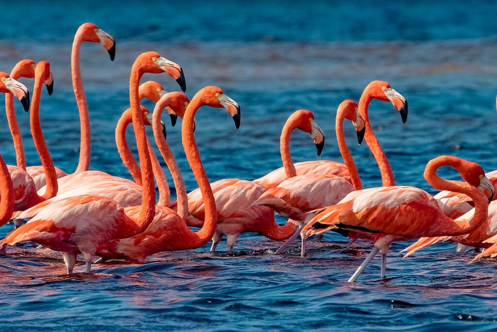 <After breakfast, we travel west to the Gulf of Mexico coast and take a boat ride to visit the Celestun Bird Sanctuary and Biosphere reserve, home to vast flocks of flamingos and herons. The area is well-known as the first stop of the migratory path of birds heading from North to Central America. If visiting at the right time, you're likely to witness thousands of flamingos painting a pink streak across the landscape. A truly magnificent sight especially with the coconut trees lining the shore of the beachhes nearby. Once you return to Merida, you’ll have some free time to relax. Perhaps take a swim in the hotel pool or embark on one last walk around the town.