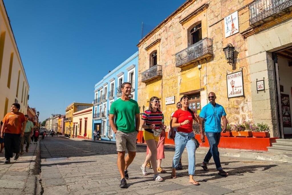 <Today we journey by local bus to Oaxaca. Oaxaca (pronounced ‘wuh-haa-ka’) is a beautiful, old colonial town full of graceful arcades and colourful markets. You'll find Zapotec and Mixtec influences around the city as ancestors have populated this region for thousands of years. Your leader will take you on an orientation walk through Oaxaca and to Mercado 20 de Noviembre – an iconic fresh food market. Here, you’ll be able to shop for fresh ingredients to put together your own meal. Grab some guacamole, salsa and some fresh tortillas on the way and then find a spot at one of the long tables where you can sit down for a classic Oaxacan lunch. Later, you’re free to walk the narrow, cobblestone streets, or maybe sit back in one of the squares, sipping mezcal and watching the world go by. The city is known for its arts scene, particularly its folk and fine art, but you'll also discover a grungier side to Oaxaca and some incredible examples of street art.
