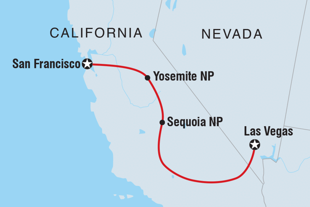 <Welcome to Nevada! Las Vegas will be your gateway to the grandeur of the Golden State. Your adventure begins with a welcome meeting at 5 pm, giving you plenty of time to bathe in Vegas’ glow. It’s recommended that you arrive a day or two early to really experience the city, allowing time to do the classics (think casinos, drive-through weddings and live shows) as well as scratching below the surface to see Las Vegas’ diverse neighbourhoods and thriving arts scene.
