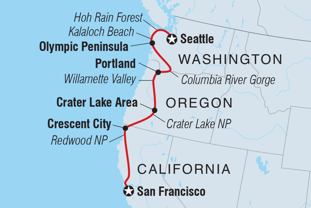 Take a scenic, nature-focused road trip from San Francisco to bustling Seattle on this nine-day adventure. Kick off your journey with a drive up the coast to see the Avenue of the Giants and Redwood National Park. After exploring these ancient wonders, discover Crater Lake, one of the most pristine lakes on Earth, formed thousands of years ago. Take a breather in the popular wine region of Willamette Valley, then hit the groovy arts scene in Portland. Visit Columbia River Gorge National Scenic Area, home to the stunning Multnomah Falls, then discover Olympic National Park with its Hoh Rainforest and beaches with a forest of dead trees on the sand.