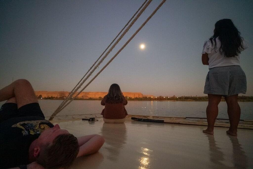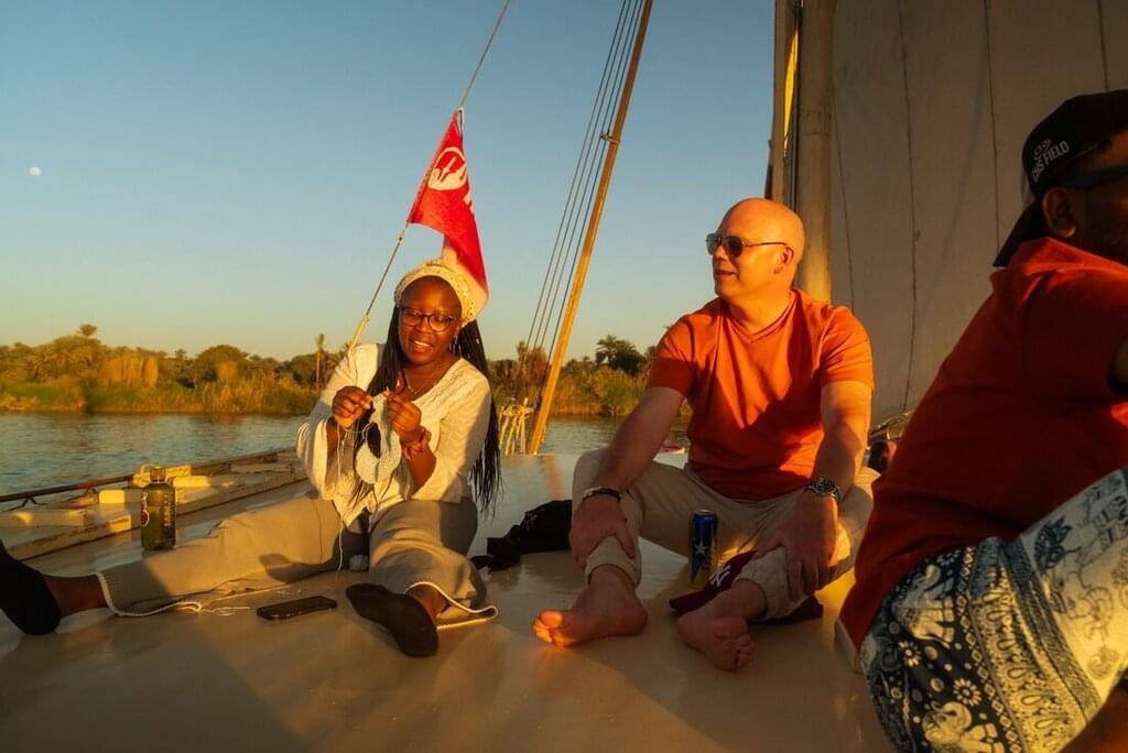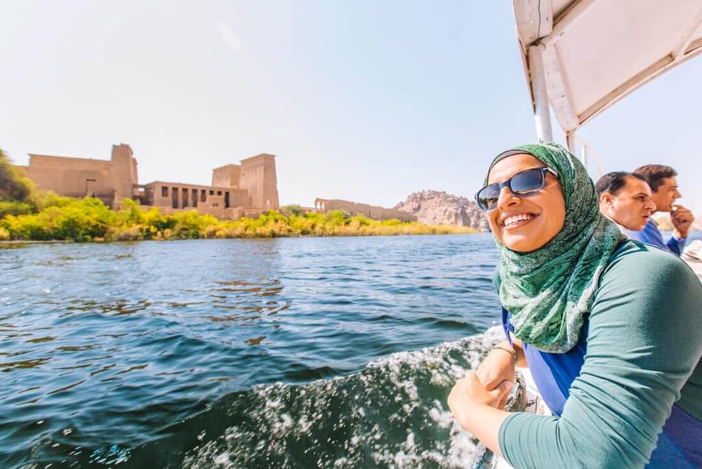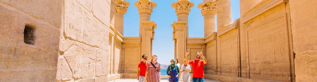 <The Nile, Elephantine Island and white-sailed feluccas. You’ll pull into Aswan – Egypt's southernmost city – at around 9am. Its easy-going charm is due in no small part to its large Nubian population. When you arrive, you’ll explore the beautiful Temple of Isis (the Goddess of health, marriage and wisdom), which was rescued from the rising waters of the Nile and relocated on Philae Island. It's a marvel of decorative pylons featuring some of Egypt's finest carvings – definitely one of the gems of Upper Egypt. This afternoon is yours to explore your way. You might choose to visit the excellent Nubian Museum, which showcases the history, art and culture of the Nubians. This evening you’ll experience modern Nubian culture firsthand with a visit to a nearby village. Join a local Nubian family for a memorable dinner where you’ll get to sample traditional dishes like okra stew or tagen, a tasty tomato-based tagen dish, with sanasel bread to mop up the delicious sauces. -