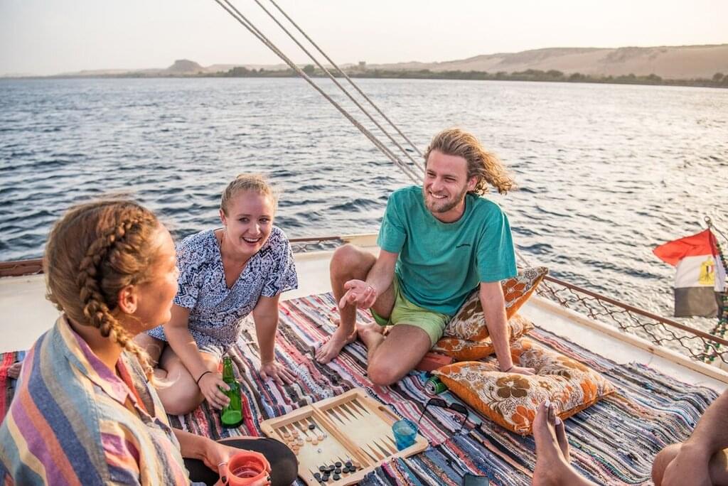 <This morning is yours to relax and recharge. Then you’ll board an overnight felucca – a bit like a floating tent, this traditional Egyptian vessel is the perfect way to explore the Nile. Spend the late afternoon amid tranquil scenery, either tucking into a good book or playing cards with your group. Depending on your group’s vibe tonight, you might like to have a little beach party under the starry night sky. Tonight, fall asleep to the gentle rocking of the boat, the warm breeze on your cheeks and the blanket of constellations above (there are no walls on a felucca, so your view will be totally undisturbed!).