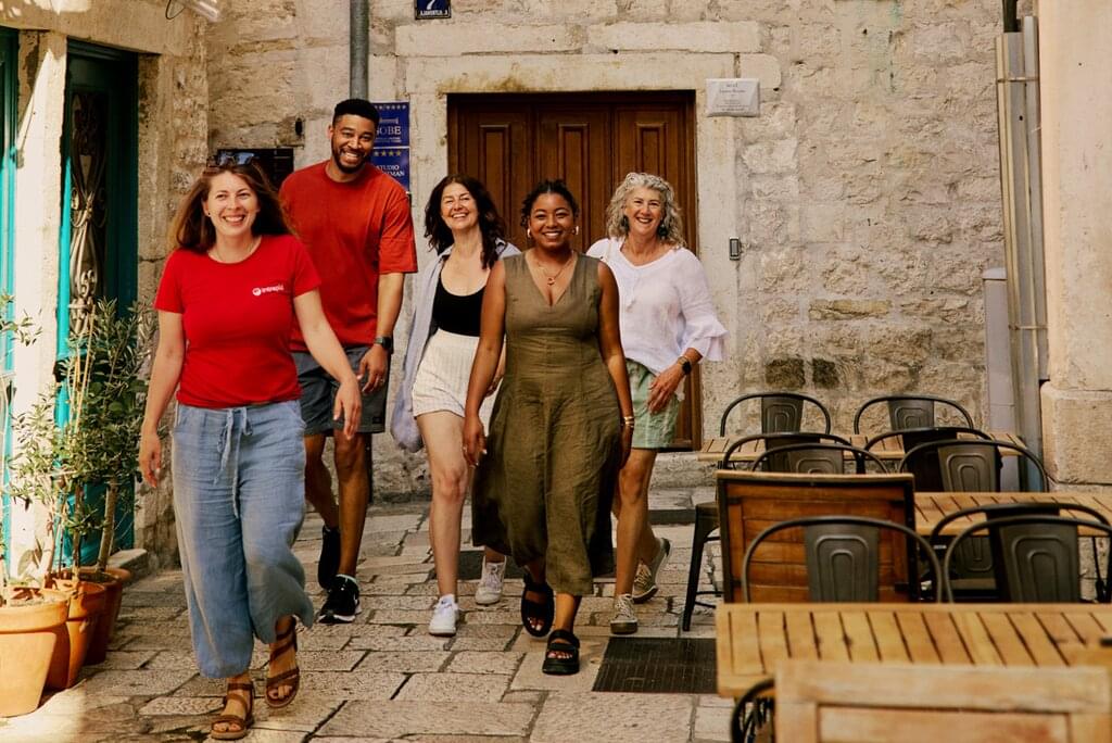 <Zdravo! Welcome to Croatia. Your adventure starts in Split with a welcome meeting at 6 pm tonight. If you arrive early, maybe wander along the waterfront, grab a gelato or visit the Old Town, where ancient Roman architecture sits among modern museums, shops and traditional homes. After your meeting, maybe join your fellow travellers for dinner at a local restaurant and try local dishes like pasticada (slow-cooked beef stew) or black risotto (seafood risotto with squid ink).
